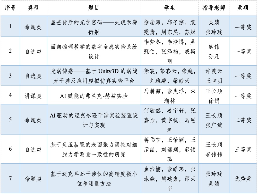 南航代表队在学校教务部的大力支持和bat365在线平台官网的精心组织下,共派出7支队伍参赛,其中有5支队伍成功晋级全国总决赛,共获一等奖4项、二等奖1项、三等奖1项,优秀奖1项,创参赛以来最好成绩!我校一等奖获奖数量与获奖比例均位居全国参赛高校前列,是一等奖覆盖所有赛道(讲课类、自选类和命题类)的高校,同时我校连续第六年成功摘得优秀组织奖,充分彰显了学院在物理实验教学与创新人才培养方面的深厚积淀。